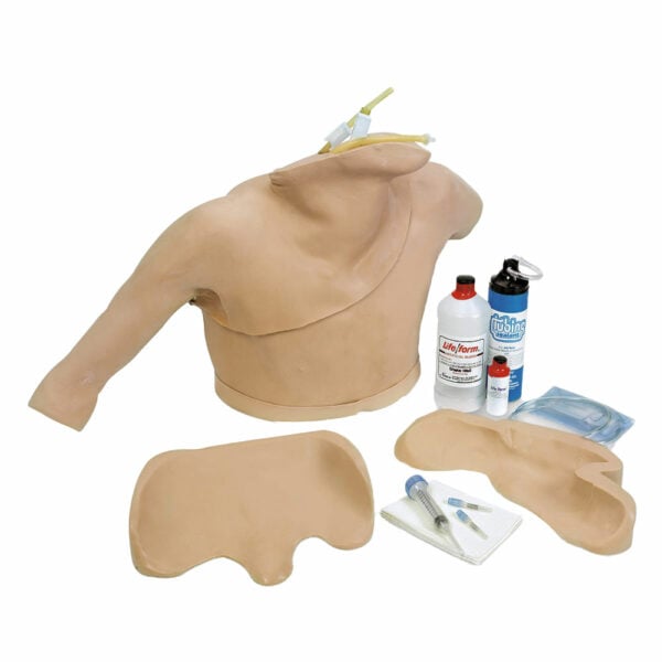 All appropriate landmarks are palpable for realistic identification of insertion sites. Synthetic skin may be removed from the shoulder to reveal dissected musculature and the location of veins, arteries, and other landmarks. With the skin in place, you can actually insert the needle introducer. Artificial blood is connected to provide confirmation of proper needle location when blood flows from the needle, just like the real thing.
